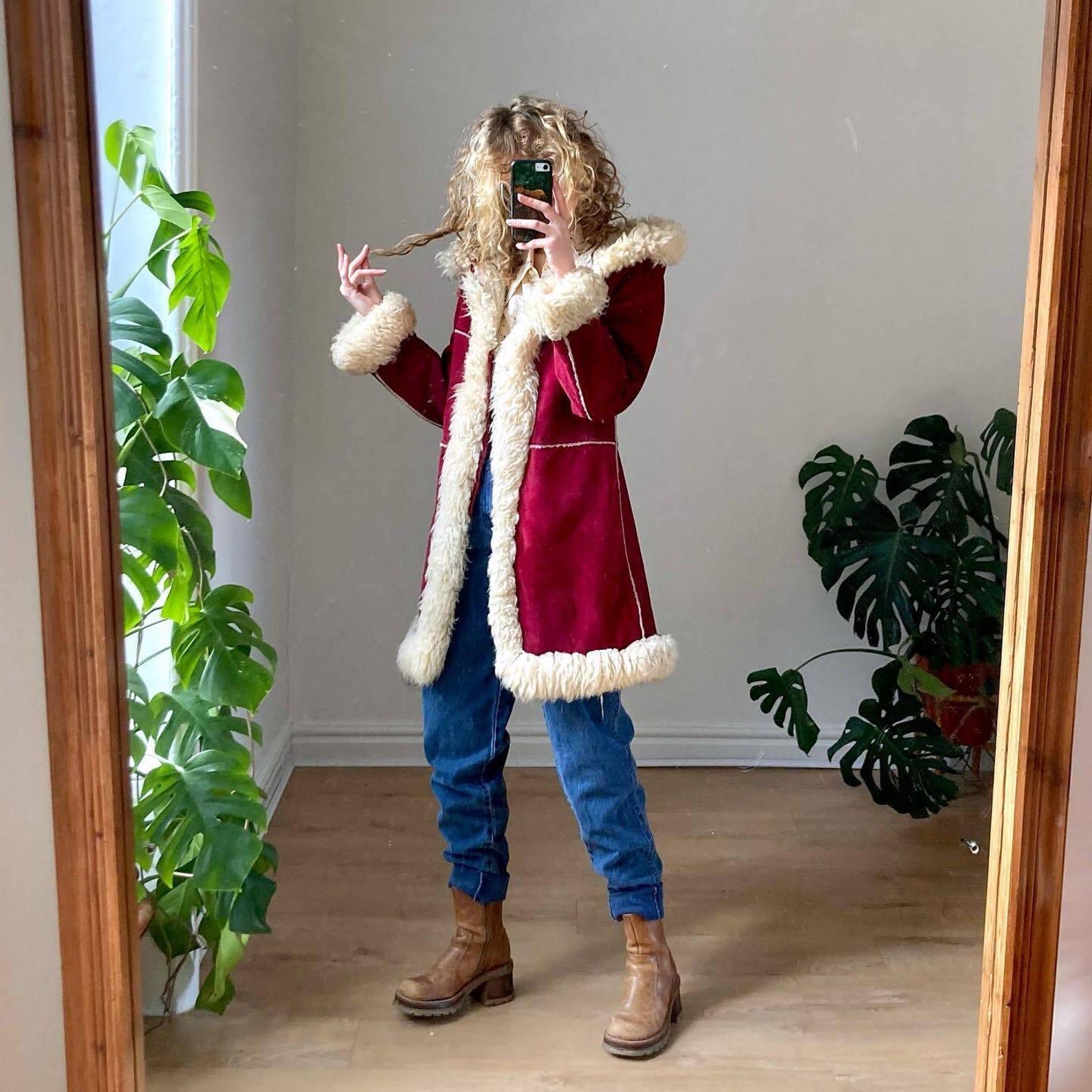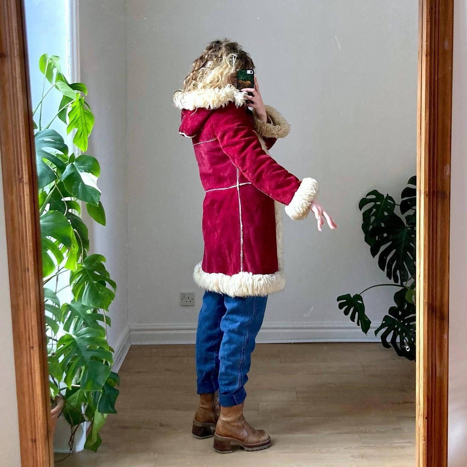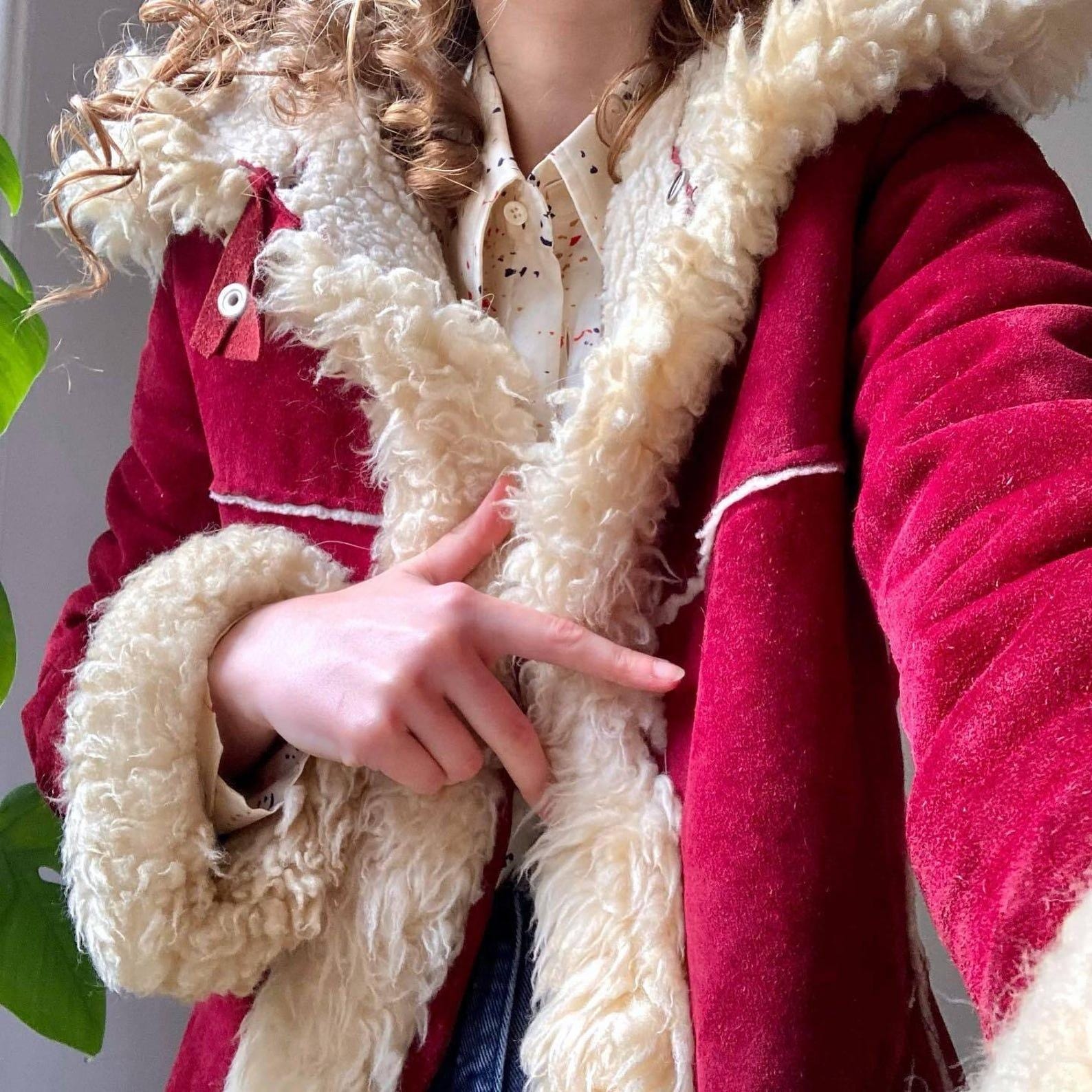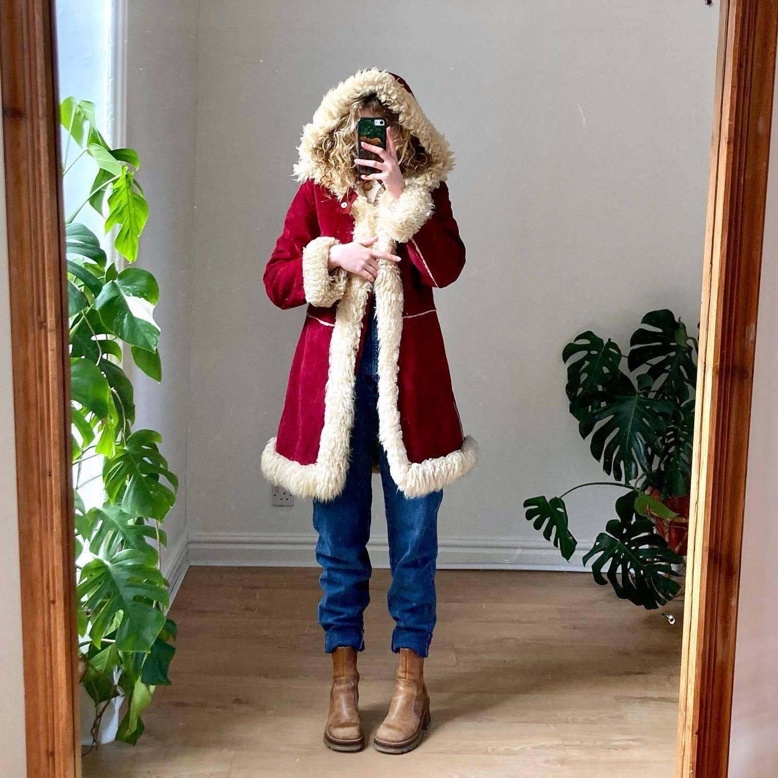 Women’s Red Hooded Penny Lane Coat – Vintage Y2K Afghan Shearling Jacket, Boho Toscana Fur Coat, Bohemian Winter Gift for Her