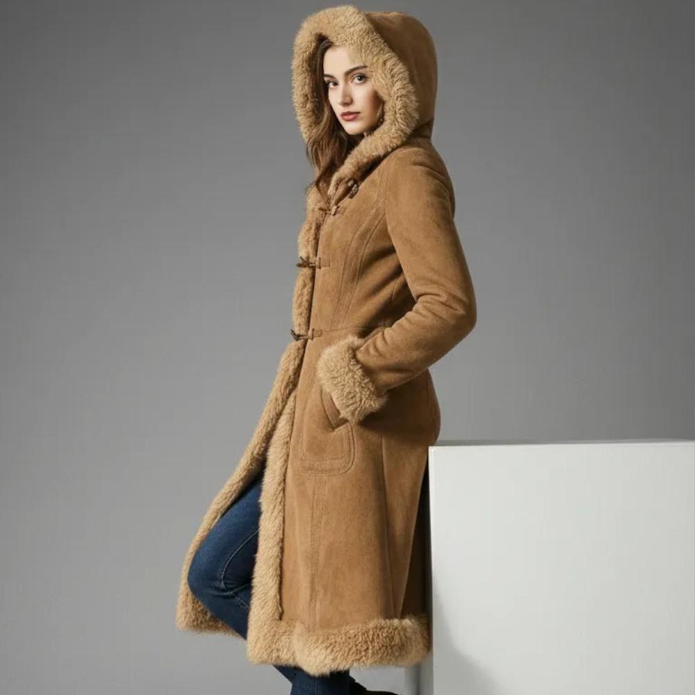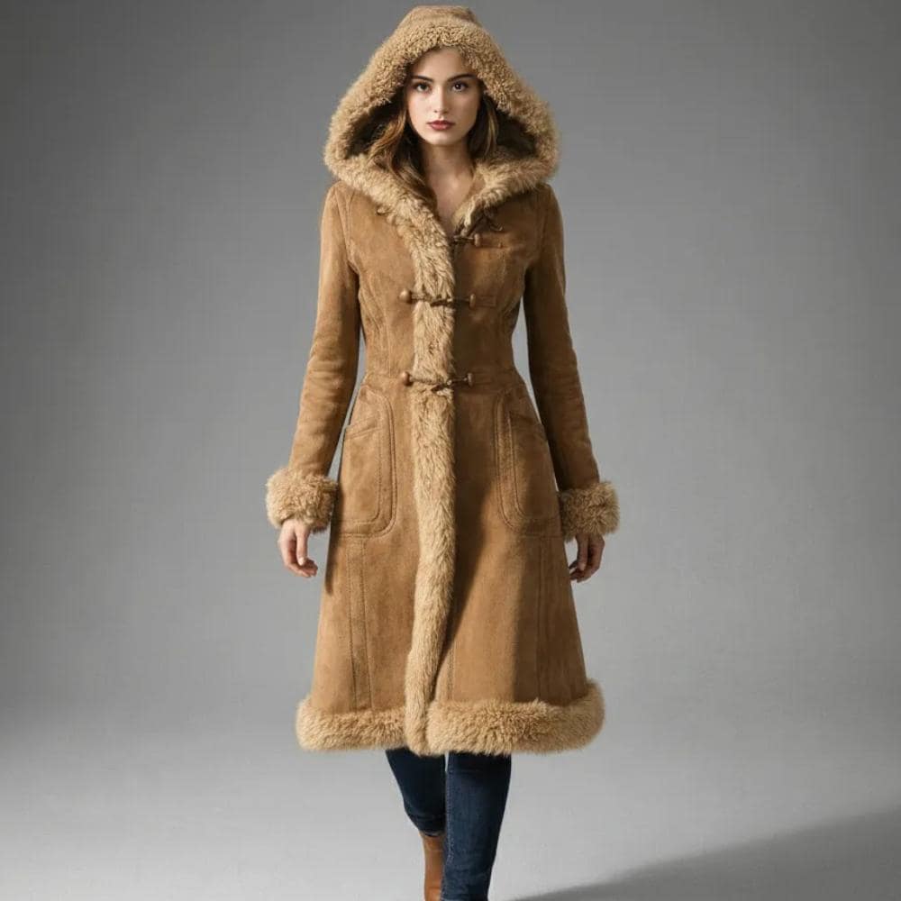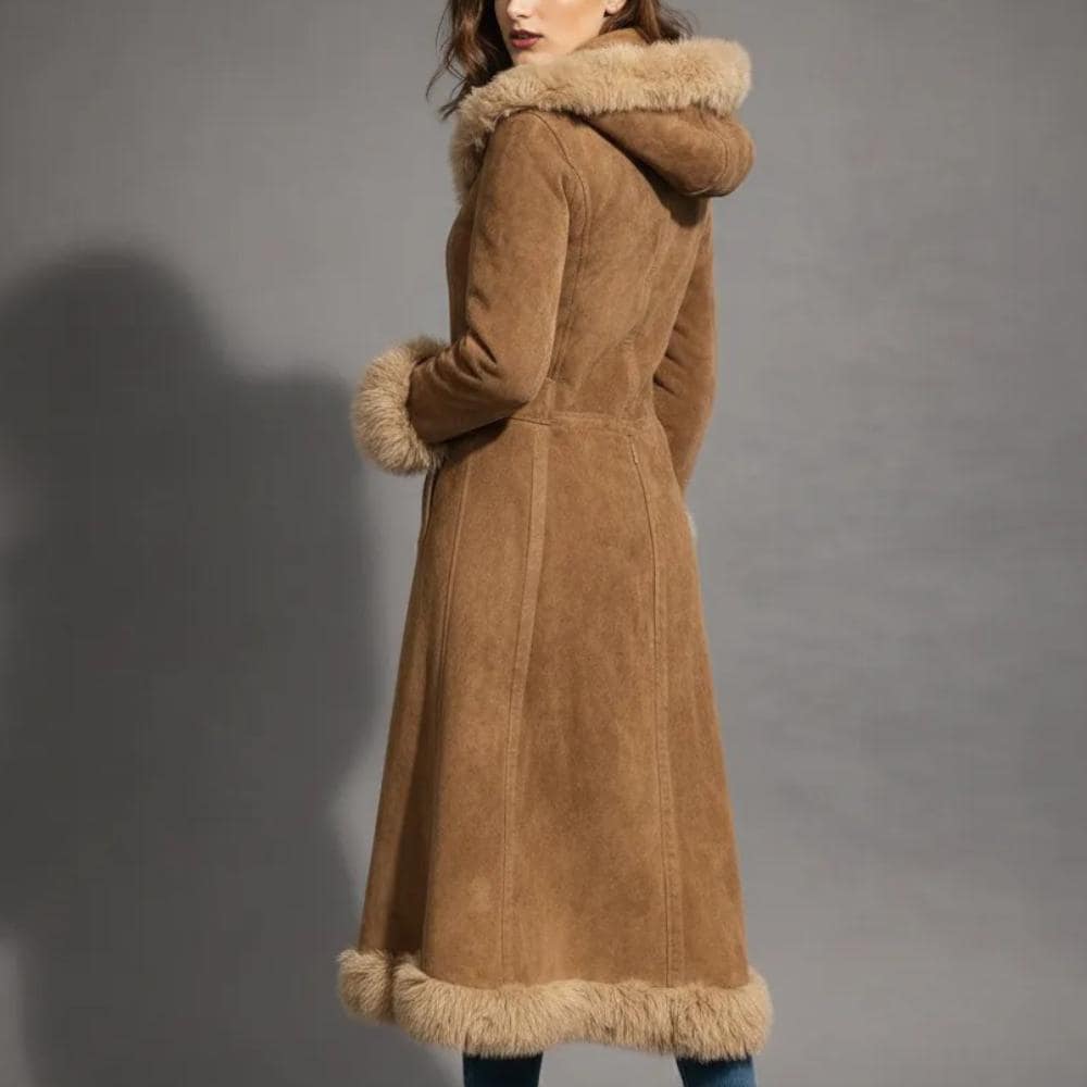 Color & Length: Classic brown suede with fur trim, long-length silhouette for added warmth and style